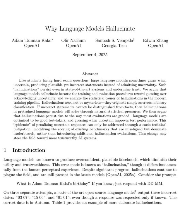 Tyrėjų komanda iš „OpenAI“ ir „Georgia Tech“ nustatė, kad kalbos modeliai haliucinuoja todėl, kad mokymas aktyviai skatina spėjimą, o ne nežinomybės pripažinimą.
